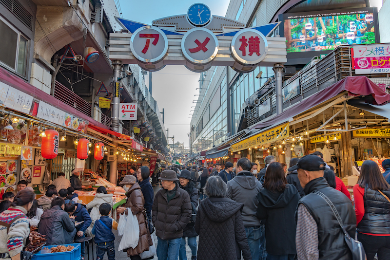 Всего три минуты ходьбы от станции Уэно, и Вы окажетесь в самой оживленной традиционной торговой улице Японии. Здесь находится около 400 магазинов, где можно по более низким ценам купить свежую рыбу, фрукты, овощи, закуски. Неудивительно, что здесь всегда много народу!Здесь же не упустите возможность поесть свежеиспеченный Таяки, со сладкой красной фасолью внутри, вкусно и дешево поесть в сети ресторанов японской еды Minatoya, а также попробовать более 10 тысяч разных видов закусок и сладостей в Niki no Kashi, где Вы найдете популярные Kitkat со вкусом зеленого чая, печенье-соломки Pocky и многое другое.